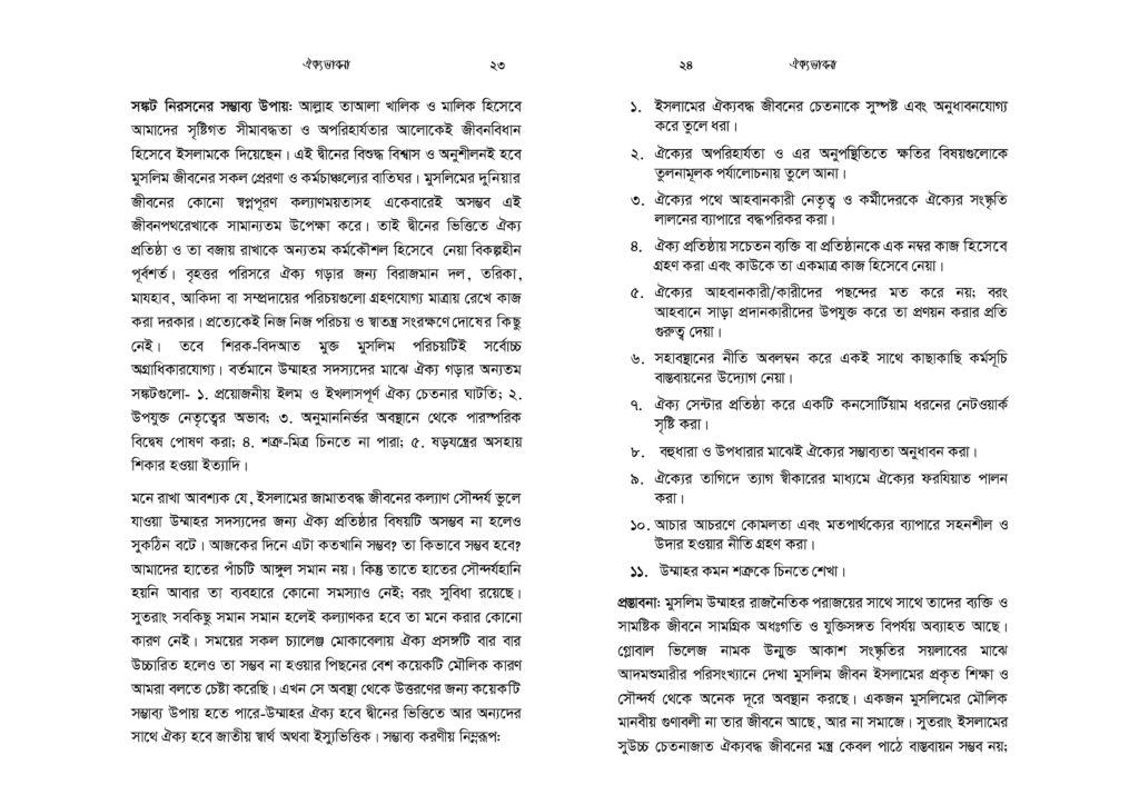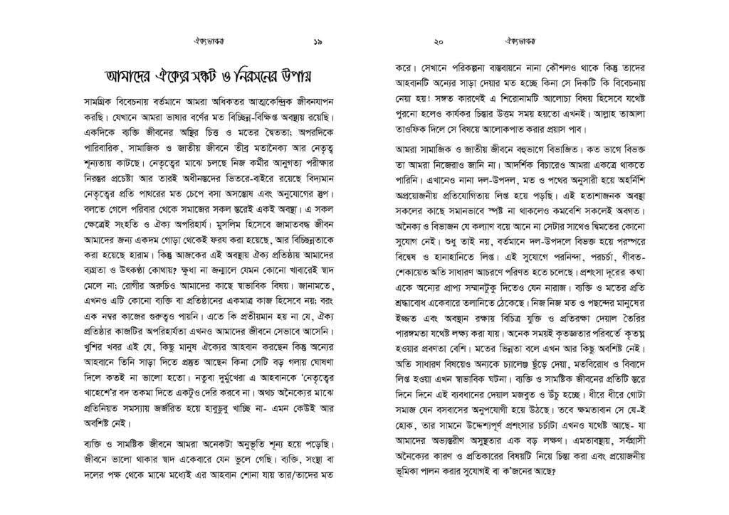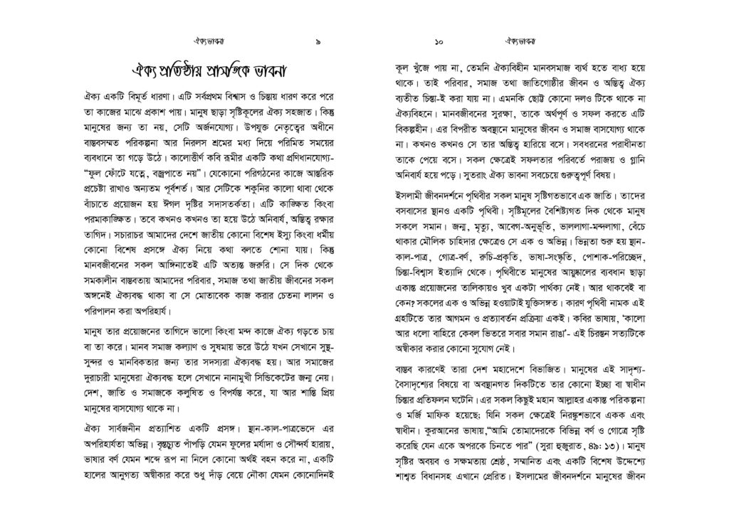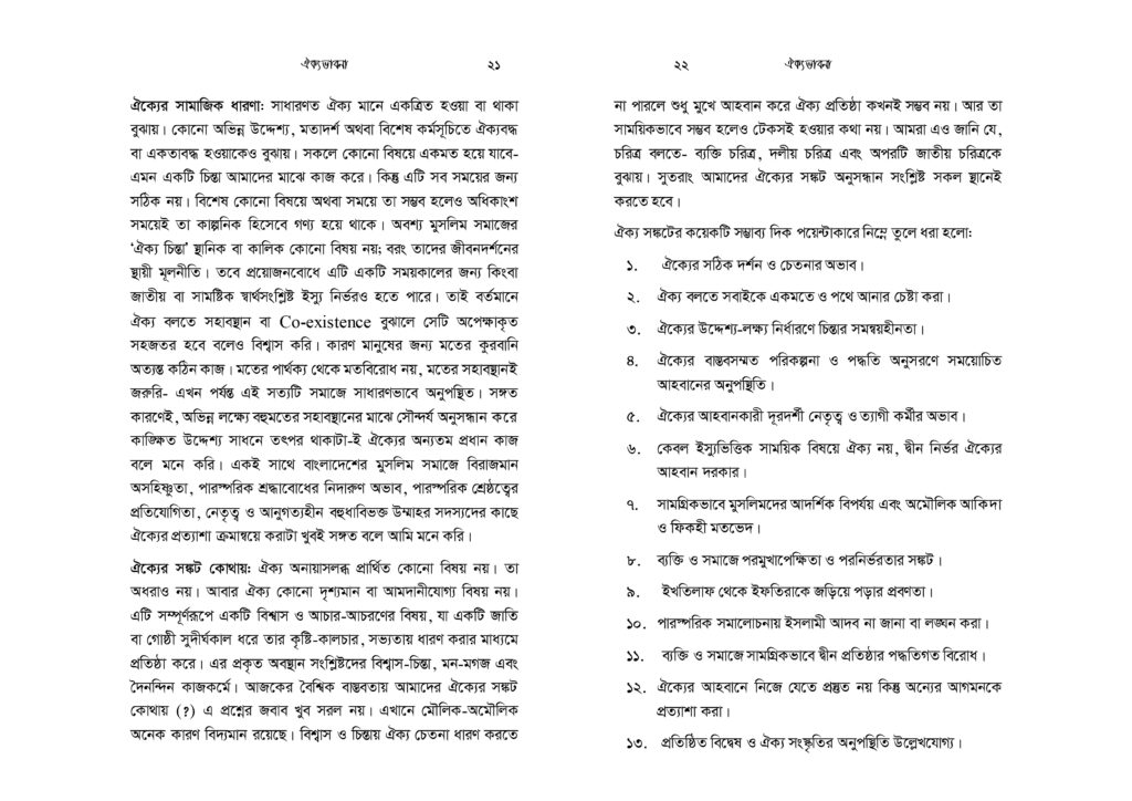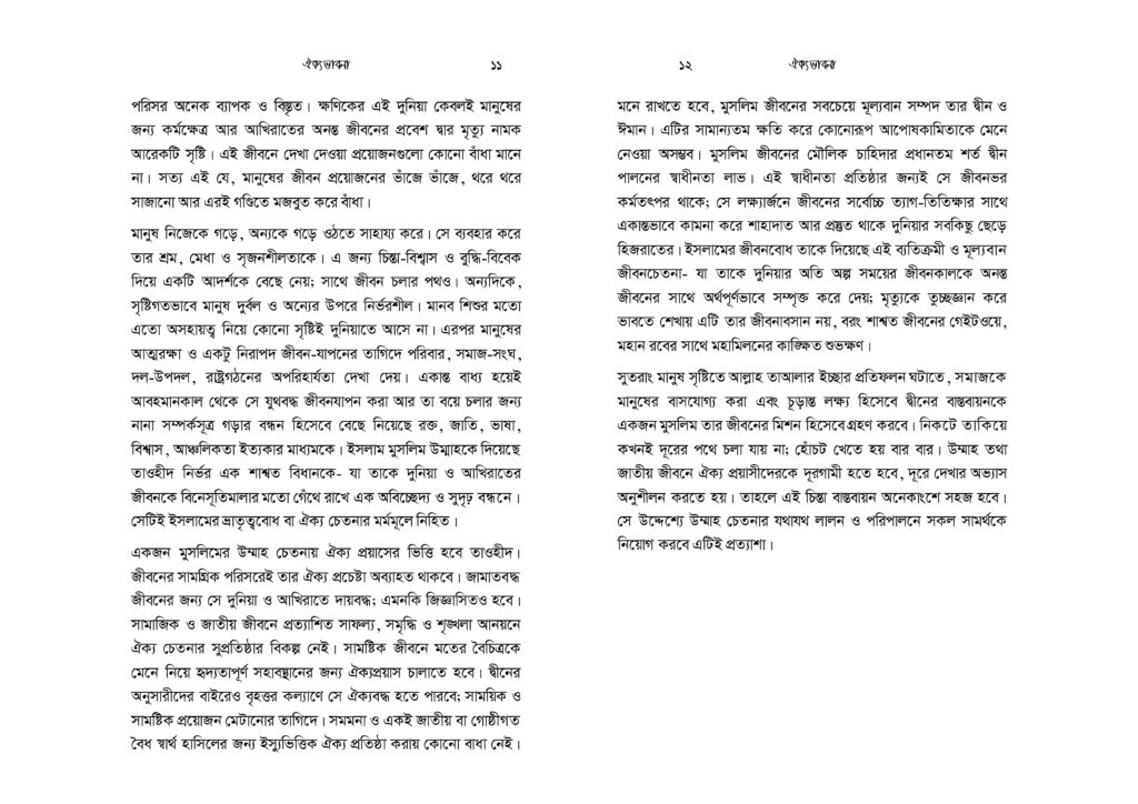 মুসলিমরা ক্ষুদ্র সাম্প্রদায়িকতার অনেক ঊর্ধ্বে অবস্থানকারী এক উম্মাহর সদস্য। যেকোনো ইস্যুতে ঐক্যবদ্ধ আদর্শিক চেতনায় উজ্জীবিত এক বিশ্ব নাগরিক তারা। কিন্তু নির্বিশেষে সবখানে কি অর্থনীতি, কি সমাজনীতি, কি রাজনীতি, কি জ্ঞান-গরিমায় সবখানেই যেন তারা আজ একবারেই অভিভাবকহীন। বিশ্বে দ্বিতীয় বৃহত্তম জাতি গোষ্ঠী হলেও মুসলিমরা যেন প্রলঙ্করী ঝড়ো হাওয়ার পরের ছিন্ন পাতার মতো ইতঃস্তত বিক্ষিপ্ত। প্রত্যেকেই যেন বৃন্তচ্যুত পাপড়ির মতো মর্যাদাহীন ও অবহেলিত। সমকালীন বাস্তবতায় উম্মাহ কিংবা জাতীয় চেতনা দূরের কথা, ছোট্ট একটি প্রতিষ্ঠান পরিবার যার সদস্যরাও পর্যন্ত নিজেরা মিলেমিশে থাকতে পারছে না। সেখানে এ কথা মেনে নিতে কোনো সমস্যা নেই যে, সকল ভেদাভেদ ভুলে উম্মাহর জন্য কাক্সিক্ষত ঐক্যবদ্ধ জীবনচেতনার জাগরণই আজকে আমাদের অন্যতম প্রধান কাজ। ঐক্যের অপরিহার্যতাকে শুধু মুখে বলা নয়, বরং ব্যক্তি ও সমাজের অনেক গভীরে যেতে হবে- এ কর্মসূচি নিয়ে। এটিকে বিশ্বাস ও চেতনার রাজ্য থেকে দৈনন্দিন চিন্তা ও কর্মপ্রবাহে নিতে হবে। অগ্রাধিকার প্রাপ্ত শিক্ষা ও সামাজিক আন্দোলনে রূপ দিতে হবে।