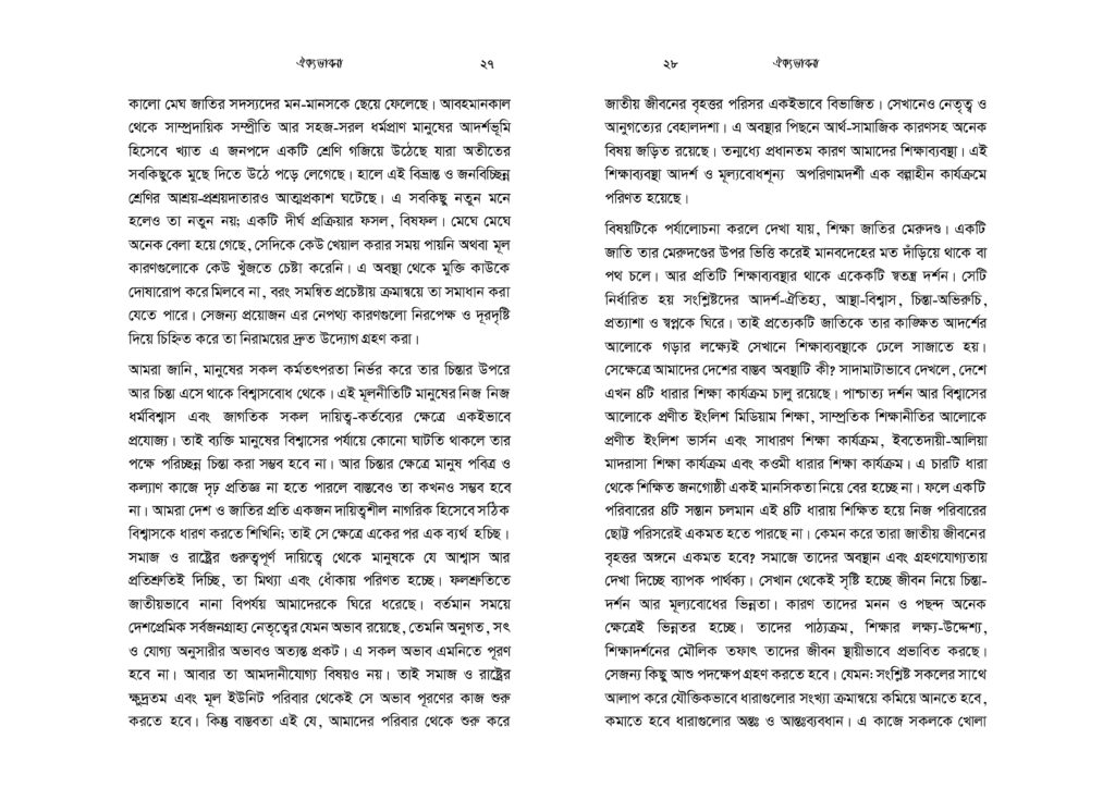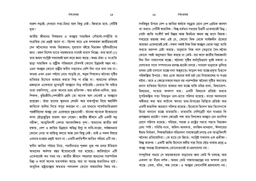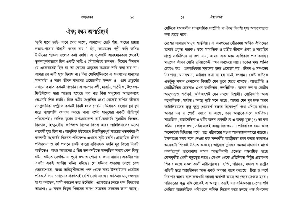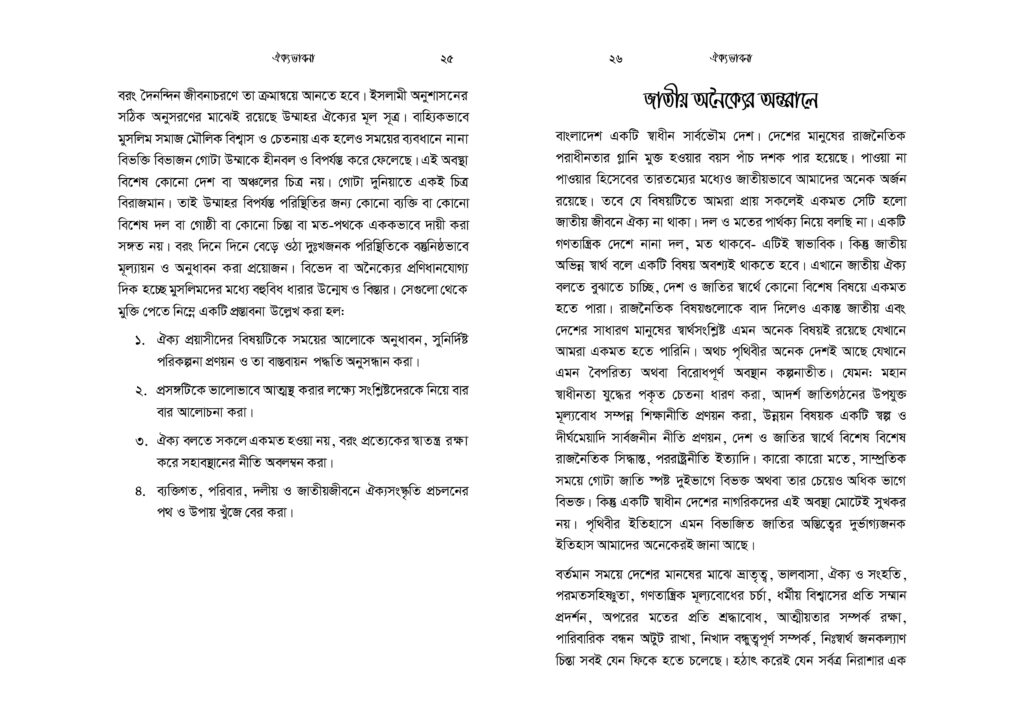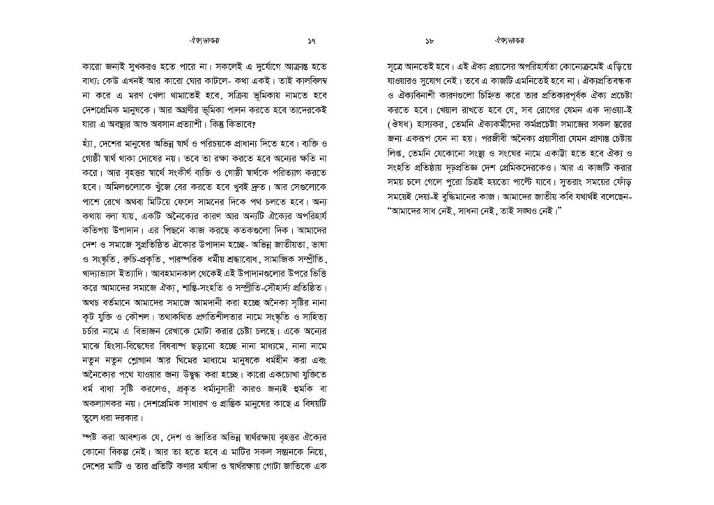 মুসলিমরা ক্ষুদ্র সাম্প্রদায়িকতার অনেক ঊর্ধ্বে অবস্থানকারী এক উম্মাহর সদস্য। যেকোনো ইস্যুতে ঐক্যবদ্ধ আদর্শিক চেতনায় উজ্জীবিত এক বিশ্ব নাগরিক তারা। কিন্তু নির্বিশেষে সবখানে কি অর্থনীতি, কি সমাজনীতি, কি রাজনীতি, কি জ্ঞান-গরিমায় সবখানেই যেন তারা আজ একবারেই অভিভাবকহীন। বিশ্বে দ্বিতীয় বৃহত্তম জাতি গোষ্ঠী হলেও মুসলিমরা যেন প্রলঙ্করী ঝড়ো হাওয়ার পরের ছিন্ন পাতার মতো ইতঃস্তত বিক্ষিপ্ত। প্রত্যেকেই যেন বৃন্তচ্যুত পাপড়ির মতো মর্যাদাহীন ও অবহেলিত। সমকালীন বাস্তবতায় উম্মাহ কিংবা জাতীয় চেতনা দূরের কথা, ছোট্ট একটি প্রতিষ্ঠান পরিবার যার সদস্যরাও পর্যন্ত নিজেরা মিলেমিশে থাকতে পারছে না। সেখানে এ কথা মেনে নিতে কোনো সমস্যা নেই যে, সকল ভেদাভেদ ভুলে উম্মাহর জন্য কাক্সিক্ষত ঐক্যবদ্ধ জীবনচেতনার জাগরণই আজকে আমাদের অন্যতম প্রধান কাজ। ঐক্যের অপরিহার্যতাকে শুধু মুখে বলা নয়, বরং ব্যক্তি ও সমাজের অনেক গভীরে যেতে হবে- এ কর্মসূচি নিয়ে। এটিকে বিশ্বাস ও চেতনার রাজ্য থেকে দৈনন্দিন চিন্তা ও কর্মপ্রবাহে নিতে হবে। অগ্রাধিকার প্রাপ্ত শিক্ষা ও সামাজিক আন্দোলনে রূপ দিতে হবে।