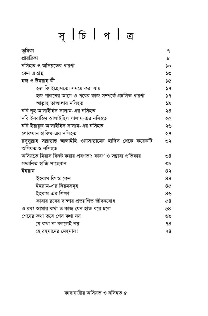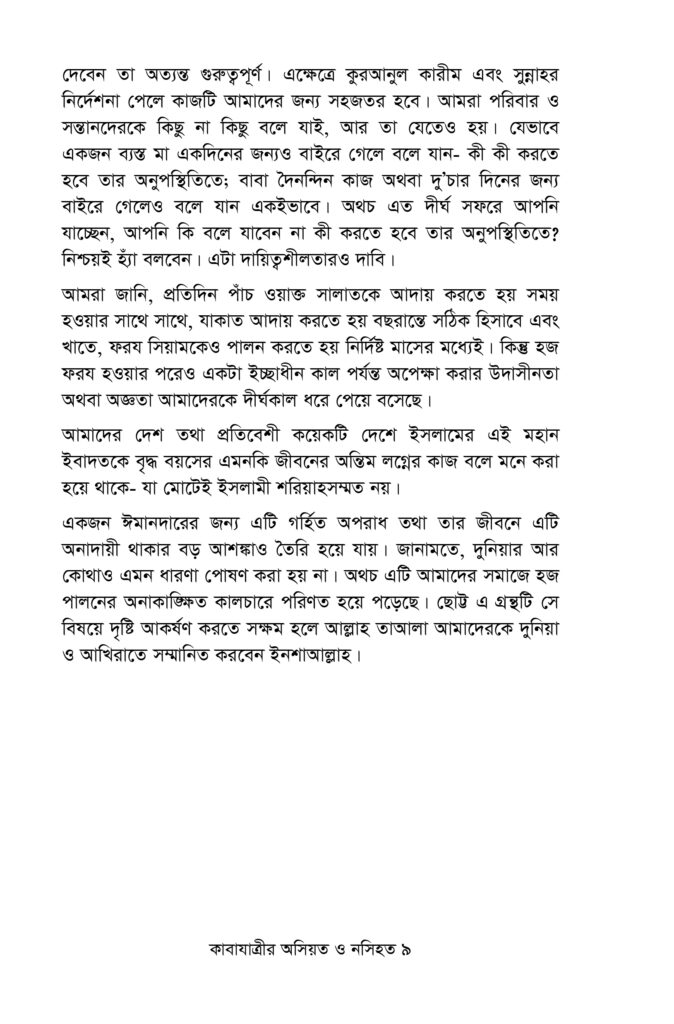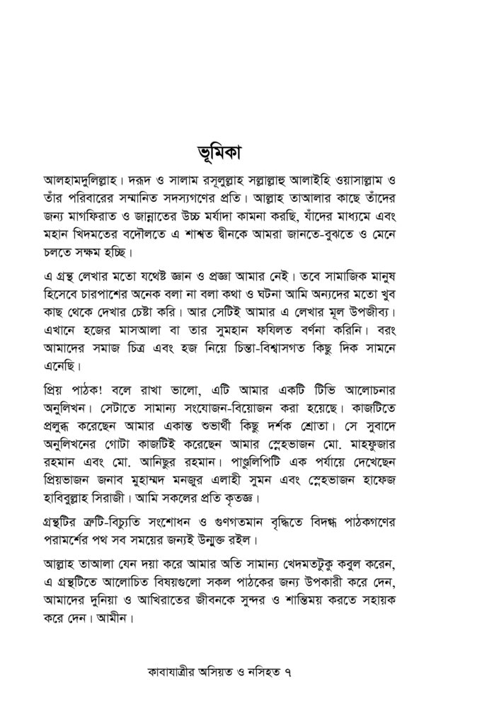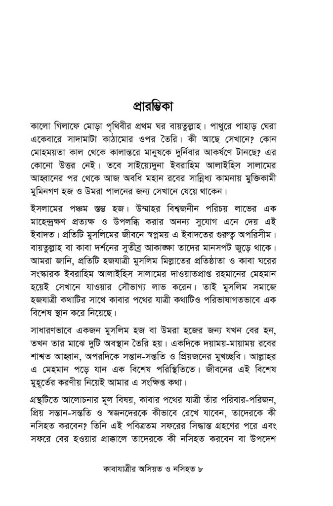 অধিকাংশের জীবনে হজ-উমরাহ এক-দু’বারের বেশি করা হয়ে উঠে না। শ্রম ও কষ্টসাধ্য বটে। কিন্তু অর্জন, অনুভব কিংবা দায়িত্বের পরিধি যে দিক থেকেই চিন্তা করি না কেন, সকল দিক থেকেই হজ-উমরা পালন অনন্য। তাই এটি সম্পাদনে শারীরিক, মানসিক, আধ্যাত্মিক, আর্থিক প্রভৃতি প্রস্তুতি অনস্বীকার্য। কিন্তু দুঃখজনক হলেও সত্য যে, অধিকাংশ ক্ষেত্রেই তড়াহুড়ার কারণে আমরা নিছক প্রথাগত কিছু তথ্য সংগ্রহ করেই কাবার পানে রওনা হয়ে যাই। তাই কাঙ্ক্ষিত তৃপ্তি, প্রশান্তি, সাফল্য ইত্যাদি যেন পেয়েও না পাওয়ার হাহাকারে হাবুডুবু খাই। এই উপলব্ধির তাড়না থেকে এমন কিছু ছোট অথচ দরকারি বিষয় নিয়ে ‘কাবাযাত্রীর অসিয়ত ও নসিহত’ শীর্ষক বইয়ের অবতারণা যা সচরাচর পাঠকের গোচরে আসে না।